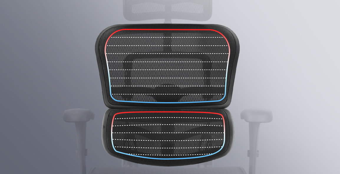 采用美国materx科技面料,以人体仿生工学设计,在座背区域提供10个不同张力的横向区域,均匀承托不同坐姿及久坐产生压力